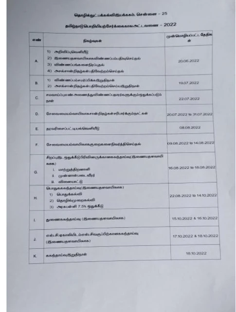 பொறியியல் மாணவர்கள் சேர்க்கை தொடர்பான அறிவிப்பு 20-ம் தேதி வெளியிடப்பட்டு அன்றைய தினம் ஆன்லைன் மூலம் விண்ணப்பப் பதிவு தொடங்கும். ஆன்லைன் வாயிலாக விண்ணப்பிக்க ஜூலை 19-ம் தேதி இறுதி நாள். 22-ம் தேதி ரேண்டம் எண் வெளியிடப்படும்.